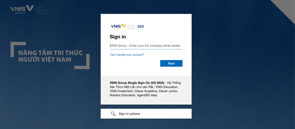 BP. CNTT của VNIS Group đã làm việc với đối tác Google, để kể từ nay, toàn bộ các users được cấp quyền truy cập tương ứng, sẽ có thể đăng nhập vào hệ thống quản lý website bằng tài khoản VNIS Group SSO (Hệ thống Xác thực Một lần) thông qua CSDL Google Workspace của VNIS Group.